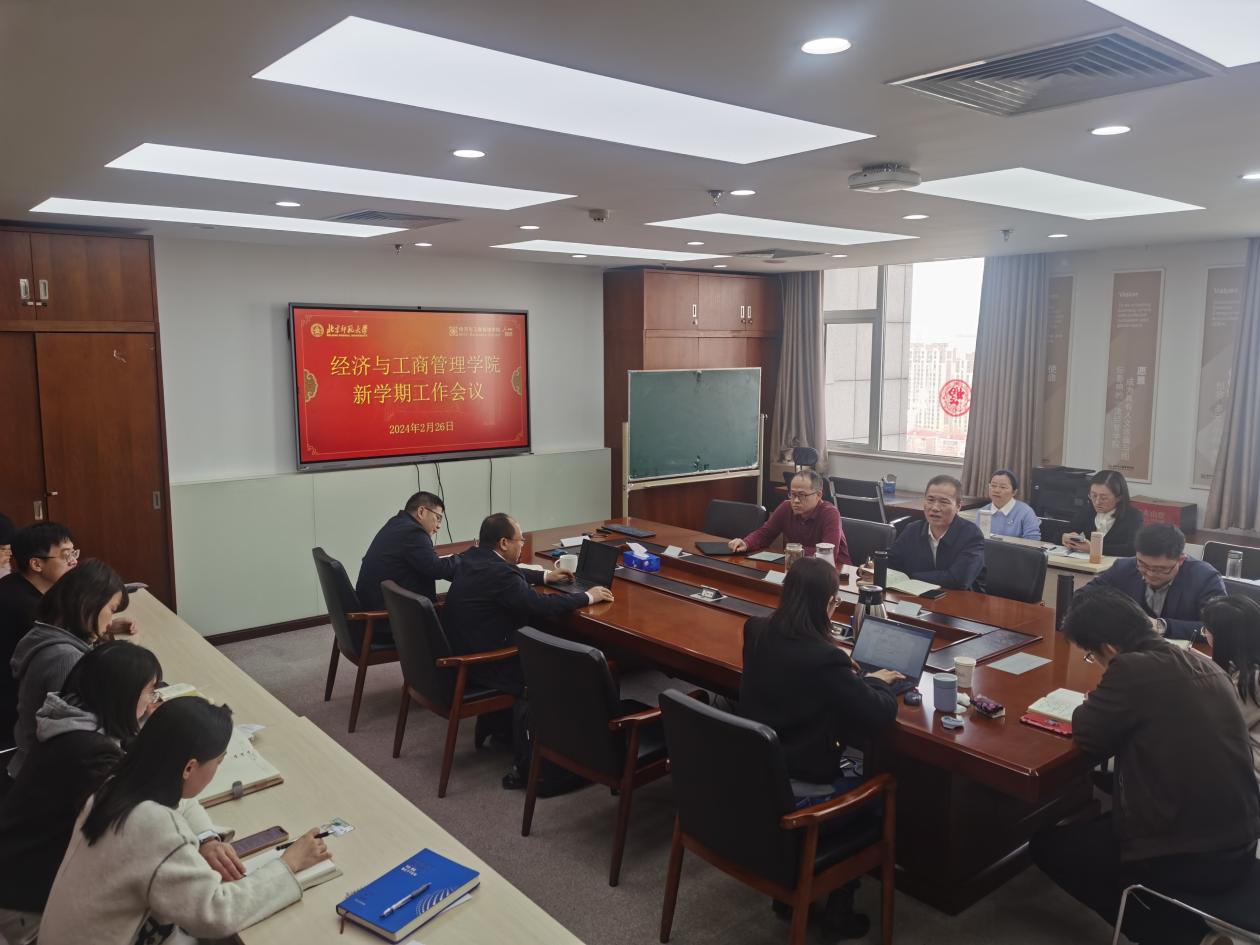 2024年2月26日上午,啪啪啦 在后主楼1722召开新学期工作会议。会上就本学期重点工作进行了研讨与部署。学院党政班子成员、各系主任、内设机构负责人等参加会议。会议由戚聿东院长主持。