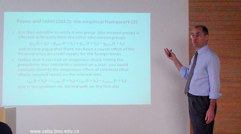 当然,对这次外教的讲课给我印象最深的还是他的专业性。此次演讲的题目是银行实证研究中的事实和方法,包括:金融中介的作用、借贷关系的特点、距离及跨国银行和最近的金融危机。一个成功的实证研究要考虑四个基本问题:1.所研究事物的因果关系;2.做什么实验能完美地研究这种因果关系;3.什么是识别策略;4.什么是合适的计量方法。对这些问题没有明确的答案的话,那最好不要开始实证分析。教授通过对大量不同文献的讲解,来讲授银行学方面的研究。在08年Freixas和Rochet的论文中,表明银行的四个功能:提供支付系统的进入;转变资产;管理风险;处理信息。