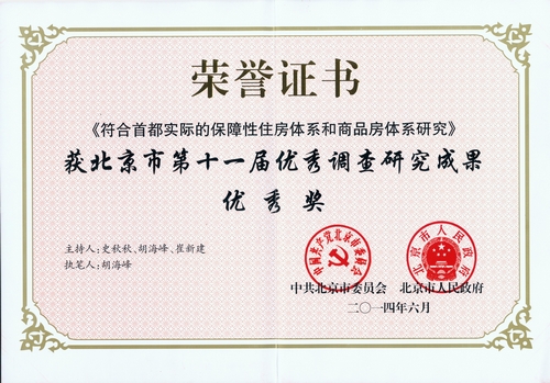 胡海峰教授主持的北京市社科联决策咨询课题研究成果《符合首都实际的保障性住房体系和商品房体系研究》,喜获北京市第十一届优秀调查研究成果优秀奖。
