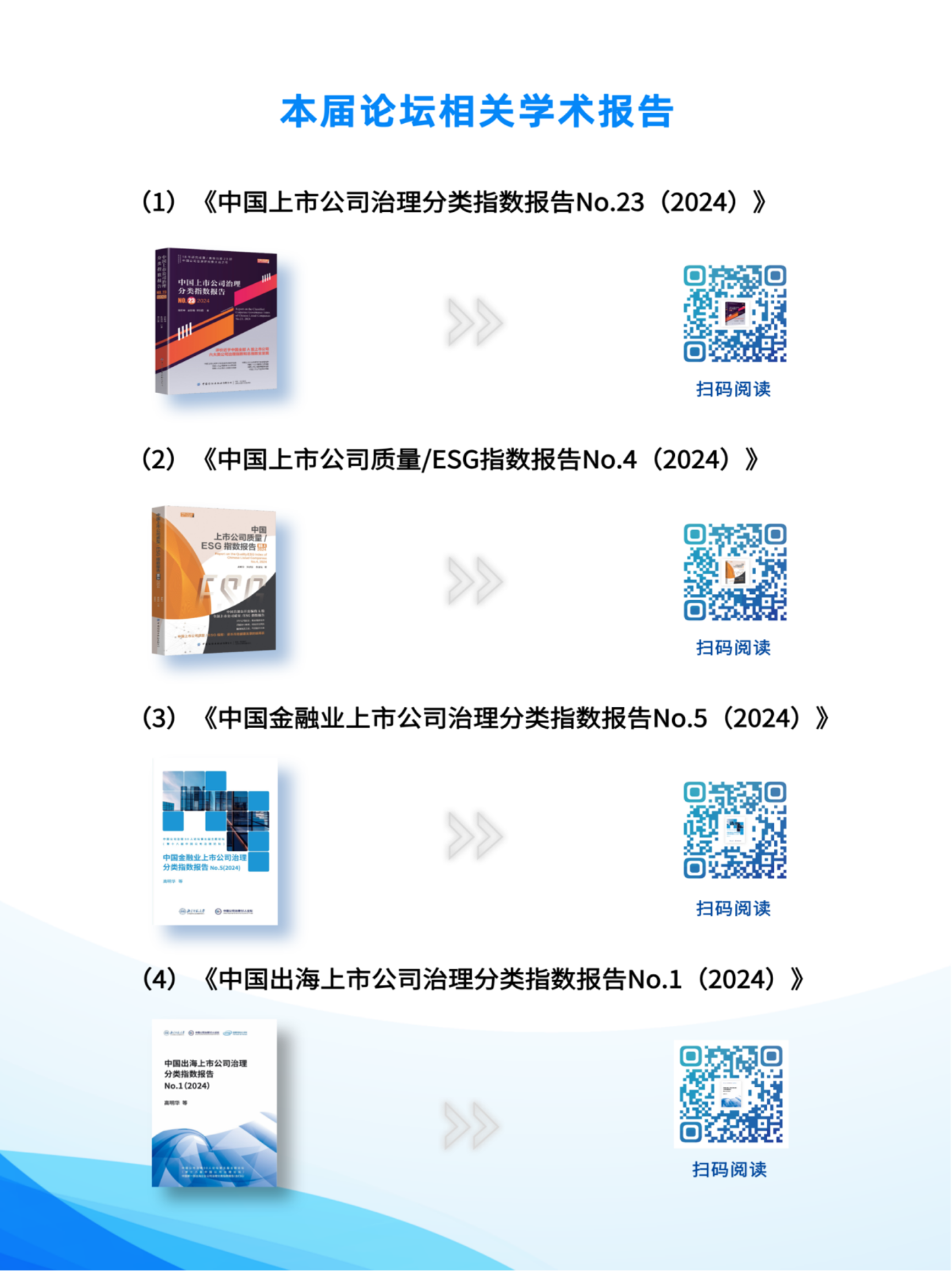 会议发布了啪啪啦 公司治理与企业发展研究中心主任、中国公司治理50人论坛学术委员会执行主任高明华教授主持完成的两份最新公司治理研究成果,即《中国上市公司治理分类指数报告No.23(2024)》和《中国上市公司质量/ESG指数报告No.4(2024)》,以及专题报告《中国金融业上市公司治理分类指数报告No.5(2024)》。《中国上市公司治理分类指数报告》已经连续出版23部,是国内连续出版时间最长的公司治理分类评价报告;《中国上市公司质量/ESG指数报告》已经连续出版4部,是国内首部公开出版的、针对全部A股上市公司的ESG评价报告;同时还建成了国内最大规模的中国上市公司治理分类指数(含ESG指数)专业性数据库。本届论坛还启动了“出海论坛”暨《2025企业出海优秀案例》征集活动。