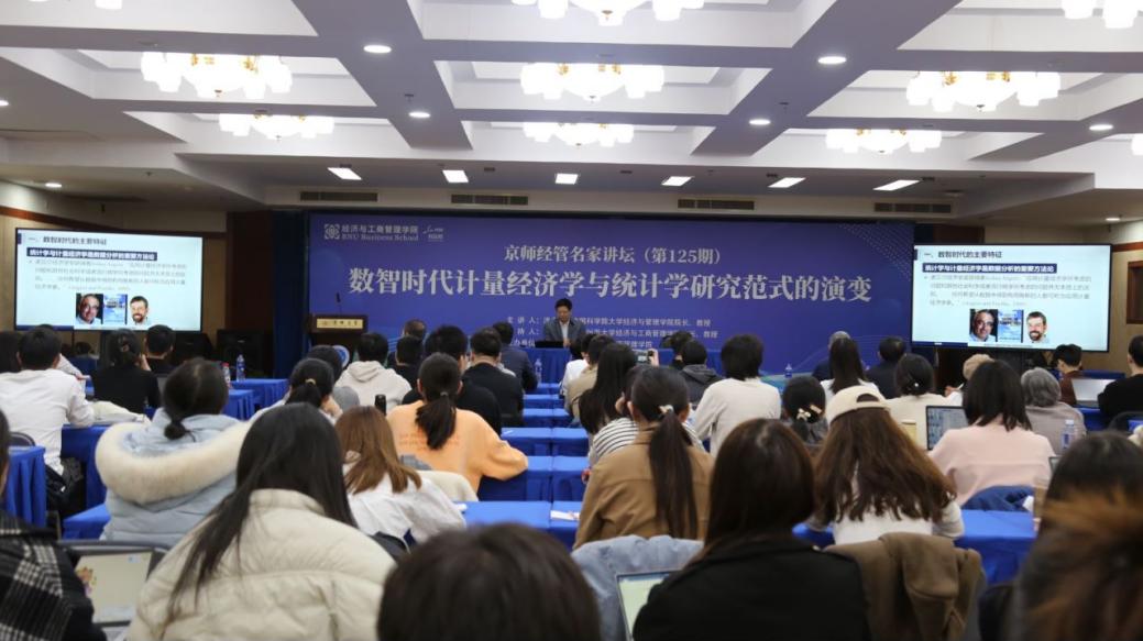 本次讲座的主题为“数智时代计量经济学与统计学研究范式的演变”。洪永淼教授从数智时代的主要特征出发,结合统计学和计量经济学中存在的七大难题,高屋建瓴地阐释了大数据和人工智能等新技术对于统计学和计量经济学研究范式的影响,并围绕大数据与统计测度、宏观统计与微观统计的交叉融合、基于大模型的统计建模范式、因果推断与可解释统计学四个方面展开讨论。讲座中洪教授不断提出问题,引导师生思考,通过展示自己与其他学者的研究、列举多个有深度的例子,为在场师生留下了深刻印象。