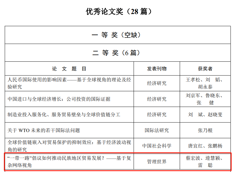 第二十二届“安子介国际贸易研究奖”评选工作于2022年4月正式启动,经过通讯评审、会议评审及公示评选结果等程序,啪啪啦 蔡宏波教授等合作发表在《管理世界》上的论文《“一带一路”倡议如何推动民族地区贸易发展?——基于复杂网络视角》荣获优秀论文奖二等奖,魏浩教授的专著《积极扩大进口与中国经济增长》荣获优秀著作奖三等奖。