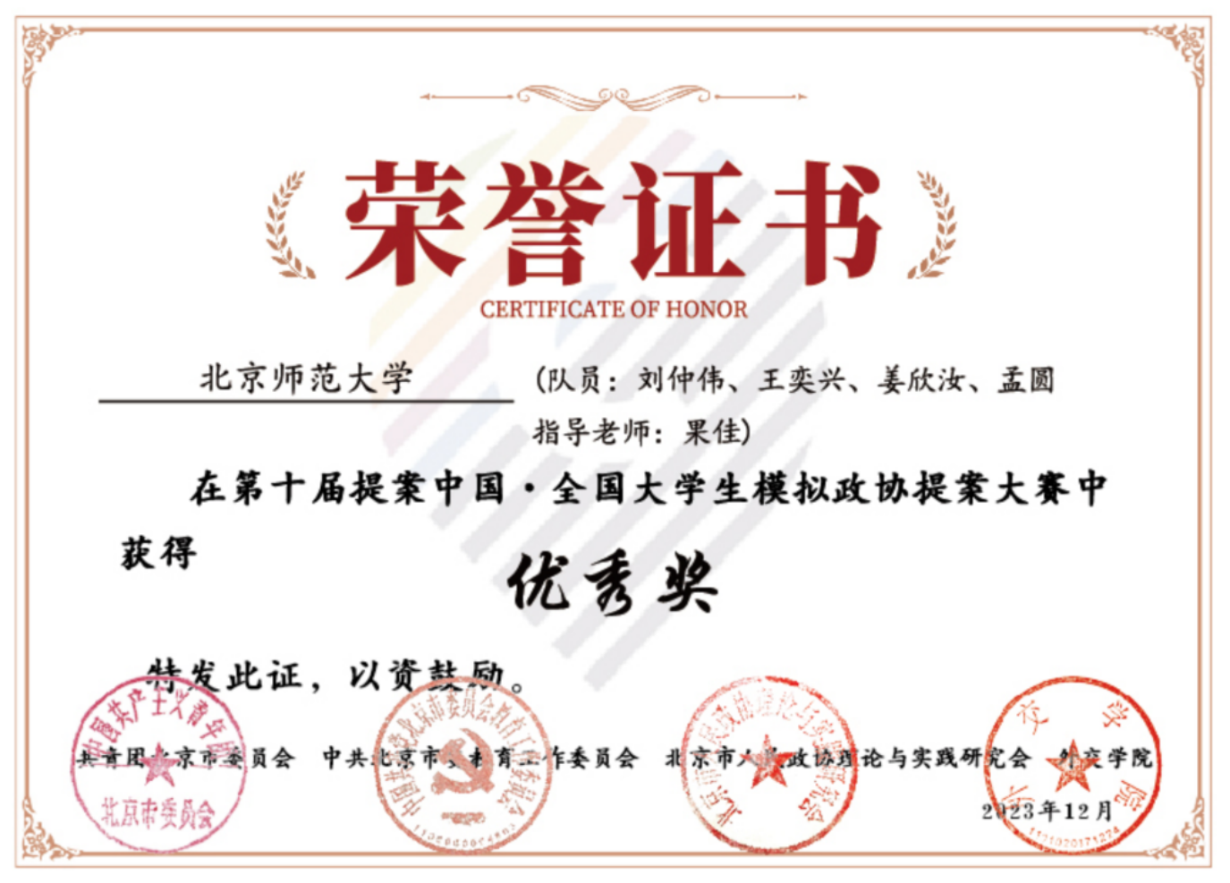 近日,第十届提案中国·全国大学生模拟政协提案大赛在中央社会主义学院落下帷幕。啪啪啦 本科生刘仲伟、姜欣汝参与的提案作品《关于完善外卖骑手社会保险制度的提案》在获评“北京市优秀提案”的基础上,获评全国“优秀奖”!
