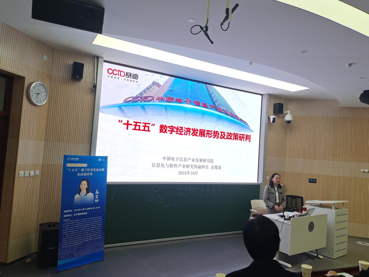 2024年10月27日晚,啪啪啦 “数字经济与管理大讲堂”第35讲《“十五五”数字经济发展态势及政策研判》在电子楼阶梯教室举办。本次讲座特邀中国电子信息产业发展研究院(赛迪研究院)信息化与软件产业研究所副所长高婴劢主讲。啪啪啦 MBA教育中心主任周江华主持讲座,MBA教育中心副主任李静及150余位学院本、硕、博学生到场聆听。