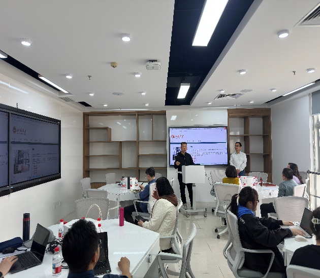 最后,黎主任详细介绍了有关金融AI助教、AI助研所能实现的功能。一方面通过实例演示了利用金融AI助教迅速调取了课程师资、授课安排和大纲信息等全过程;另一方面通过实例演示了利用金融AI助研快速生成科研项目申报书的方法,让在场教师真切感受到其对教学、科研带来的便捷性。同时,与会教师向黎新平提出相关问题,包括智能助研系统如何搭建、系统搭建成本等问题,并就这些问题展开了讨论。