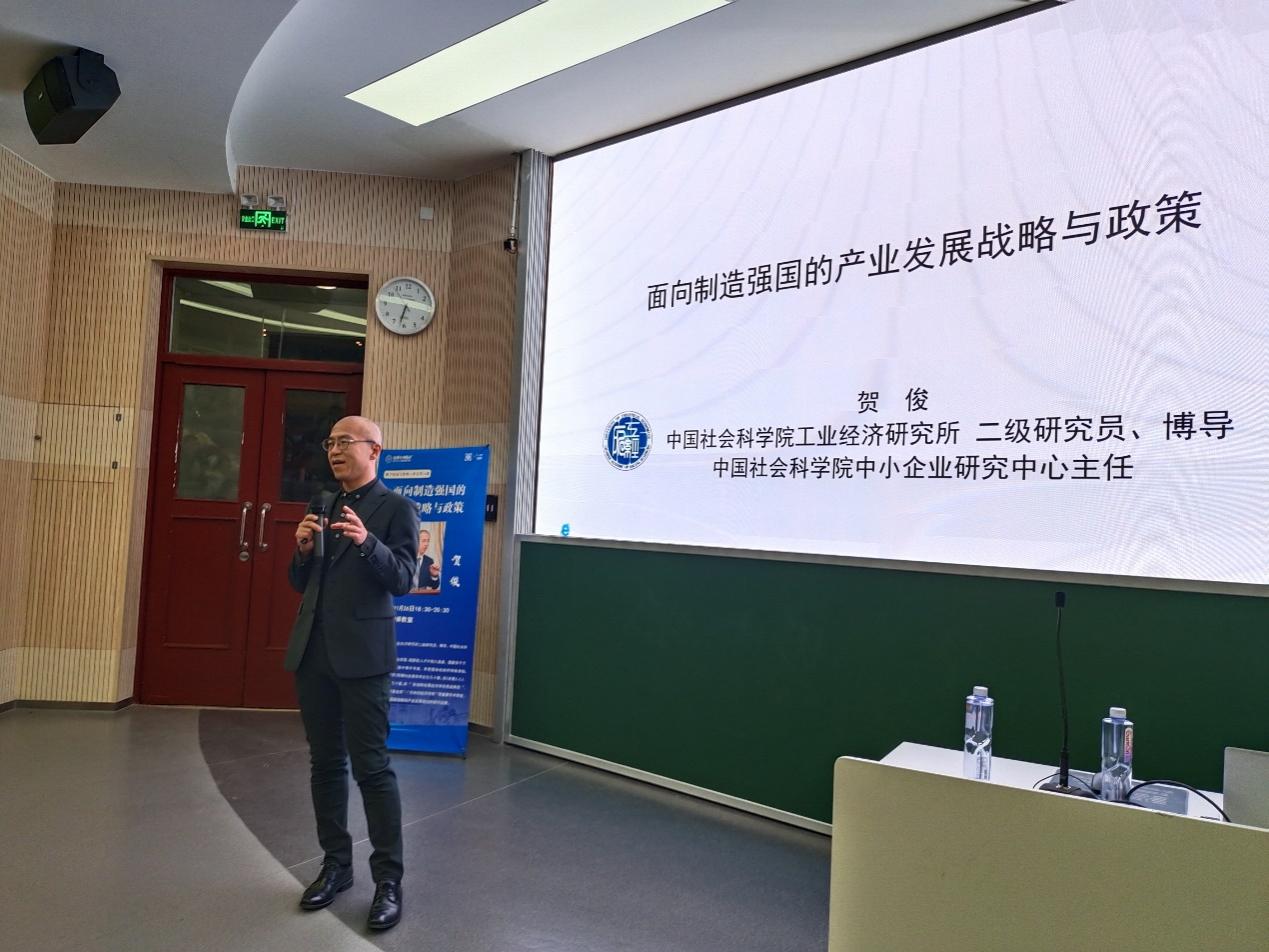 2023年11月26日晚,啪啪啦 “数字经济与管理大讲堂”第24讲《面向制造强国的产业战略与政策》在电子楼阶梯教室举办。本次讲座特邀中国社会科学院工业经济研究所二级研究员、博导、中国社会科学院中小企业研究中心主任贺俊主讲, MBA教育中心副主任李静主持,近200名学生到场聆听。