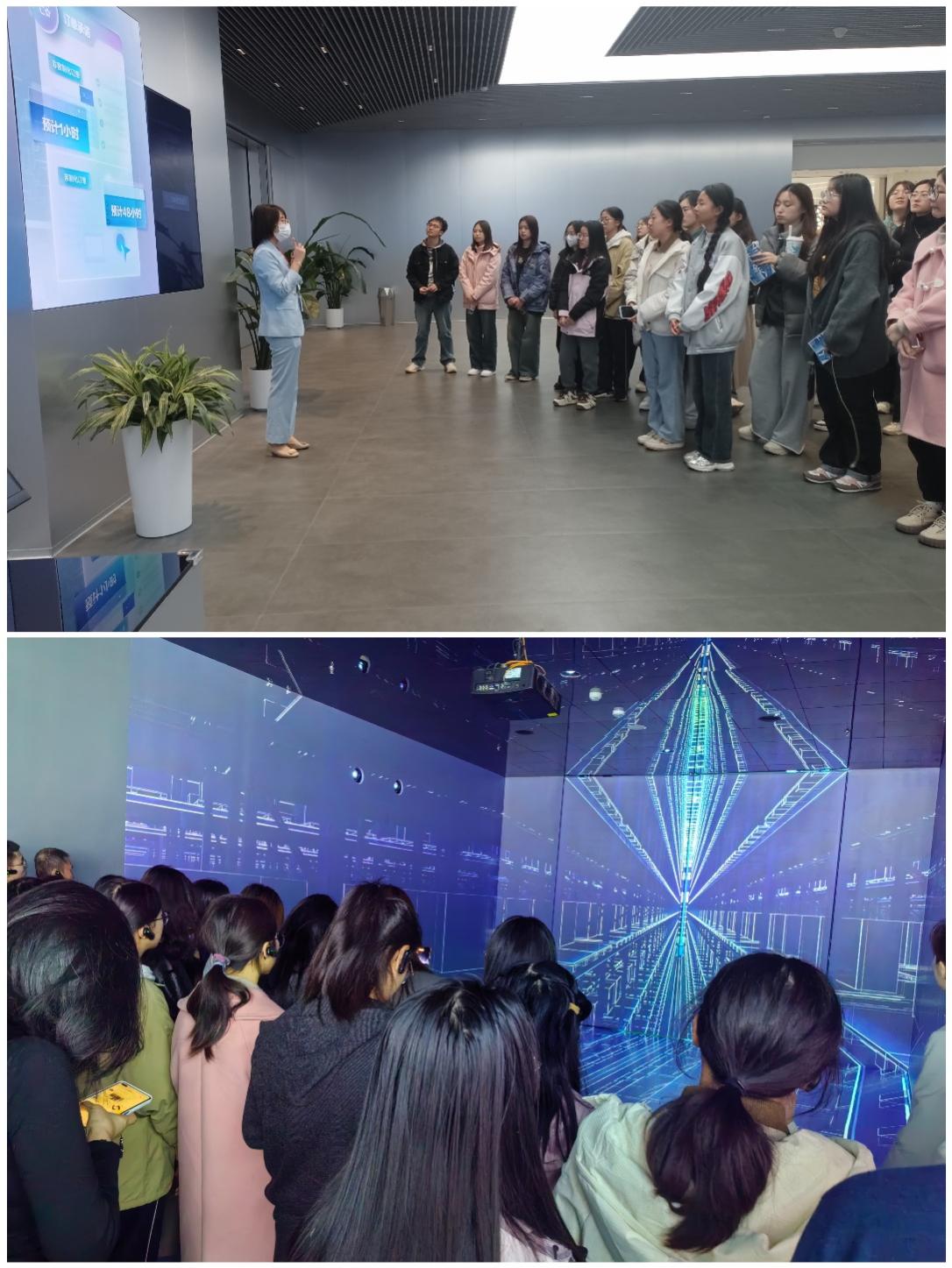 在参访正式开始前,大厅的“智慧环”就给予了同学们来自AI数字技术的震撼,它由三个可升降的圆环形装置组成,象征着AI技术中信息流动的连续性与无限可能性,圆环的起伏变化呼应着AI大模型中数据的持续传递与学习迭代过程,指引同学们从天津的过去看向“未来”。随后,讲解员在沙盘前为师生讲解了联想集团的部门及业务构成,加深了同学们对联想公司的理解和认识。