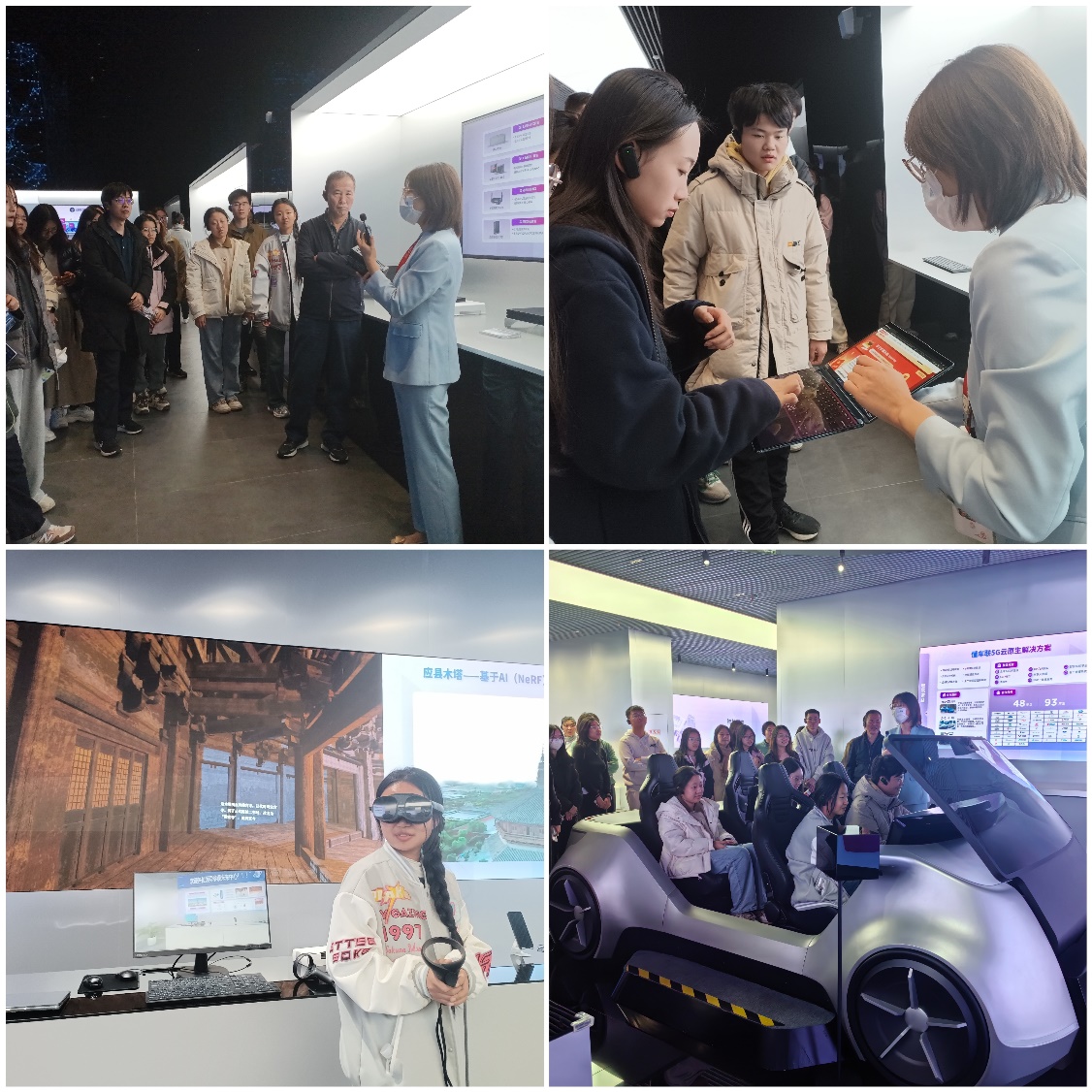 在“行业智能”展区,讲解员从联想创业历程出发,讲述了企业的数字化进程。讲解员通过操作联想新一代笔记本电脑生动展示了“联想小天”智能体如何领跑AI终端,再以此为引,依次展示了联想如何利用AI数字技术赋能智慧汽车、智慧教育、智慧文旅、智慧金融、智慧创投等领域。惊讶于数字科技发展之快的同时,不少同学更是怀着激动兴奋的心情体验了联想汽车、VR参观等项目,亲身体会数字化技术带来的便利——小到日常生活的衣食住行,大到文物古建的保护,数字科技发展与人类、与文明都息息相关。