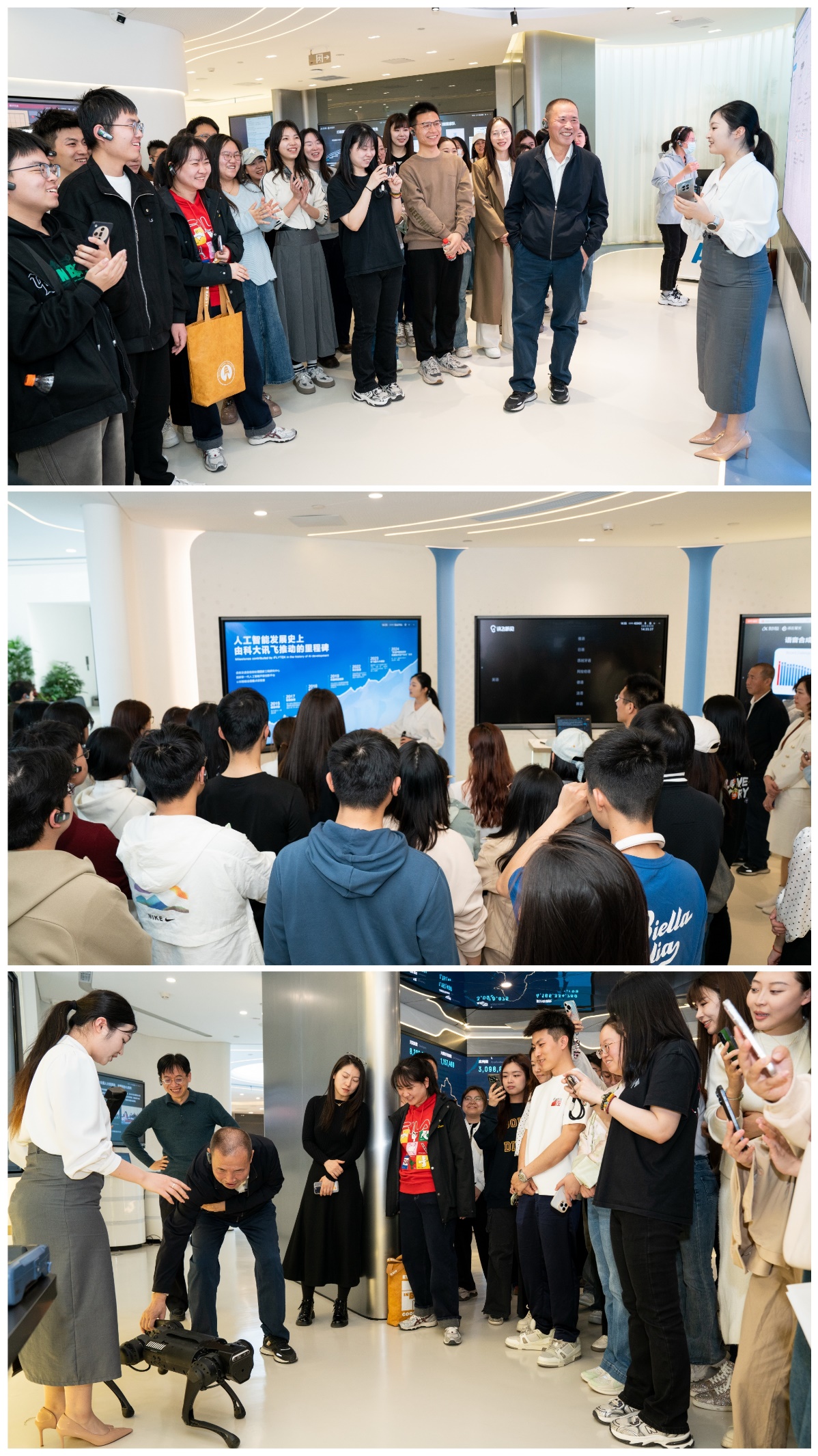 首先,师生们在工作人员的引导下参观了科大讯飞智能展厅,了解了科大讯飞的发展历程、业务板块和科技创新成果。展厅通过多媒体互动、实景模拟等方式,生动展示了科大讯飞在教育场景、医疗应用、商业办公等领域的探索与实践。讯飞听见同传会议系统、双屏翻译机、智能办公本等产品吸引了师生们的广泛关注,这些产品不仅体现了科大讯飞在人工智能技术上的深厚积累,也展示了人工智能技术如何为人们的工作和生活带来便利与变革。特别是基于讯飞星火认知大模型 V3.0 推出的垂直领域智能工具星火科研助手,深度融合多模态交互、复杂数据处理与跨学科知识整合能力,让同学们对人工智能技术在科研领域的应用有了直观的认识。