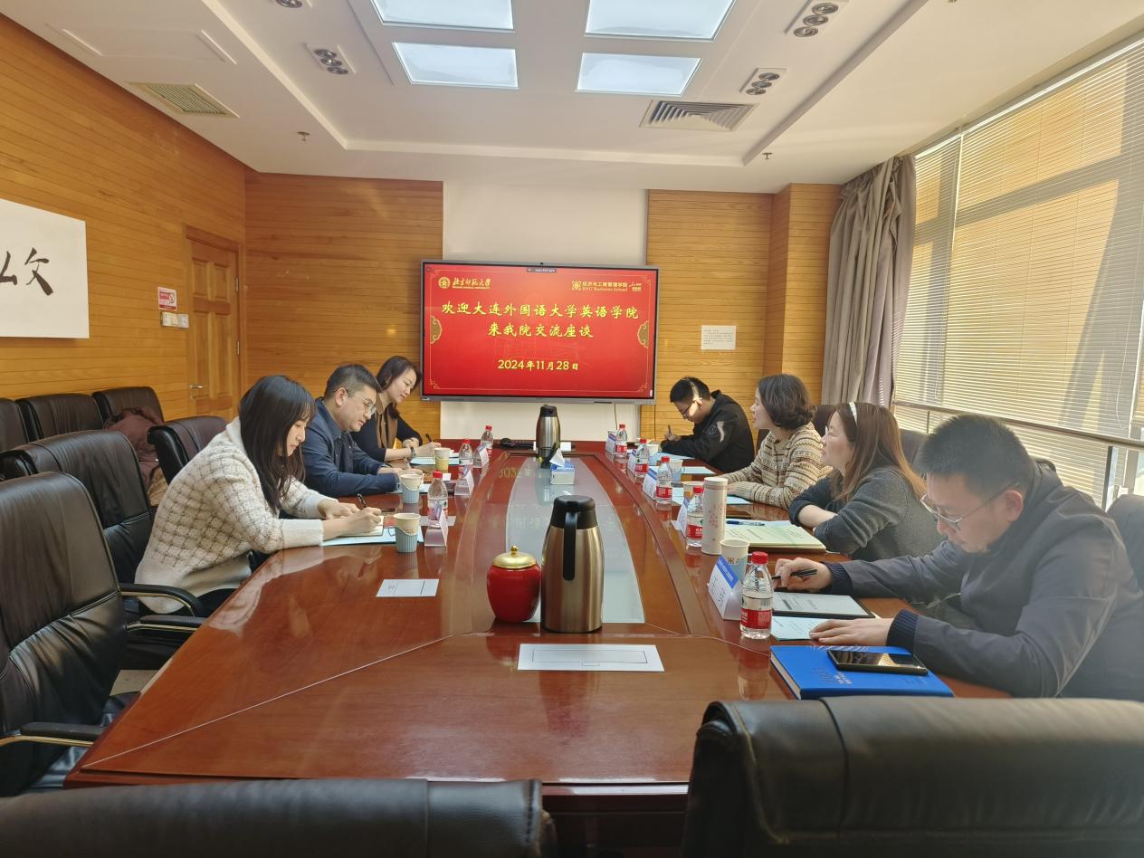 2024年11月28日下午,大连外国语大学英语学院党委书记兼副院长梁若冰、商务英语专业主任于红霞、研究生党支部书记黄新智一行3人来啪啪啦 进行调研交流。学院党委副书记、副院长江婕、数字经济与管理系副主任童琼璐、办公室主任王玮、党委组织员王骏、经济与资源管理研究生党支部书记鲁煜晨参加了此次调研座谈会。