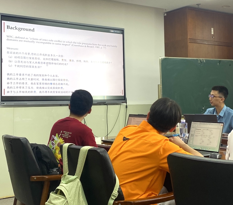 在讲座的讨论环节中,参会的师生们表现出极大的热情,就文献中的理论假设、研究方法以及数据分析进行了深入探讨。许多同学提出了关于WFC与压力关系的具体问题,并分享了自己的观点和见解,蔡子君老师对此一一回应,现场气氛十分热烈。最后,蔡子君老师总结了当天的分享内容,并展望了未来的研究方向,表示将继续为学院师生带来更多前沿研究的分享。