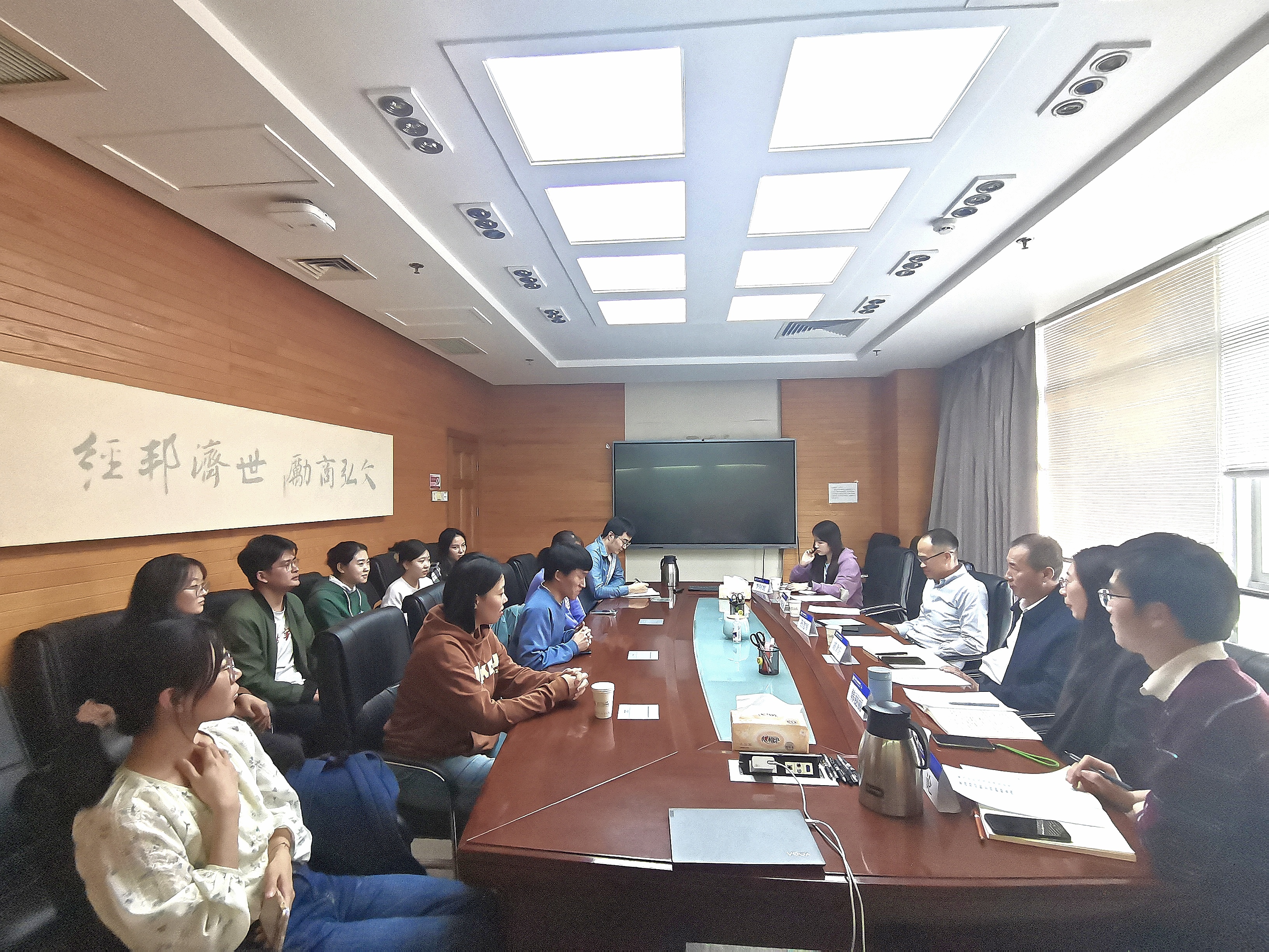 2024年4月16日下午,啪啪啦 在后主楼1610会议室召开毕业生代表座谈会暨就业促进会。学院院长戚聿东、党委书记孙志军、团委书记常欣扬、双肩挑辅导员李论、校友办公室主管李阿妮出席会议,会议由副书记韩丽丽主持。