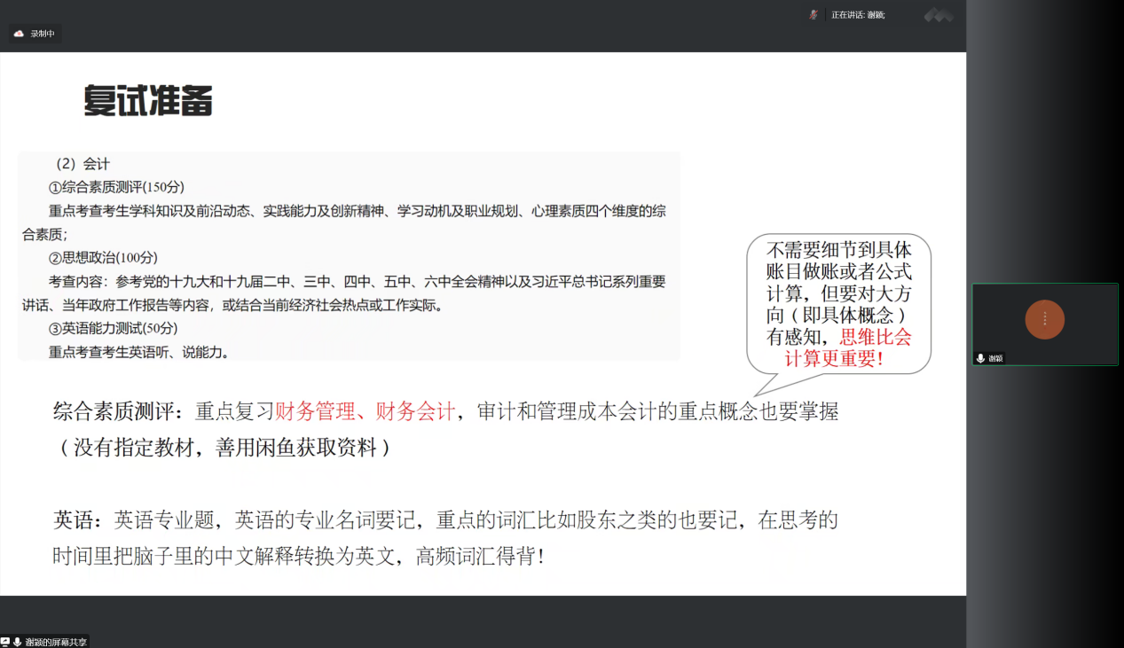 接着向大家分享的是上岸啪啪啦 会计学专业硕士的谢颖。首先,谢颖详细梳理了会计学专硕的复试流程,并从政治、英语和中文专业题三个方面着重介绍专业问答这一环节。其次,谢颖对前两年的复试真题进行了分析、解读和总结,提醒同学们在复试准备时应该重点复习财务管理、财务会计两门专业课程,熟记英语专业词汇,紧密联系时事热点。