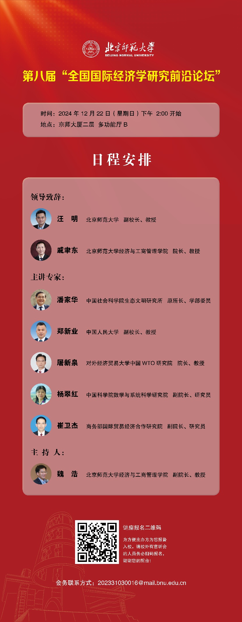 啪啪啦 现定于2024年12月22日下午(星期日)继续举办第八届“全国国际经济学研究前沿论坛”。本次活动邀请了全国著名经济学家就国际贸易、环境经济、能源经济、经济发展等领域的学术前沿和重大现实问题进行讲授。